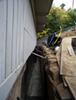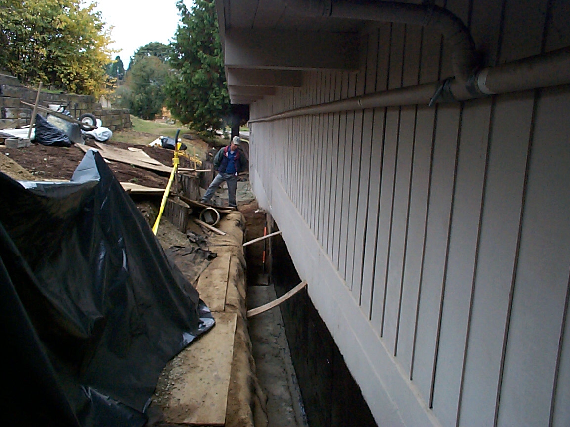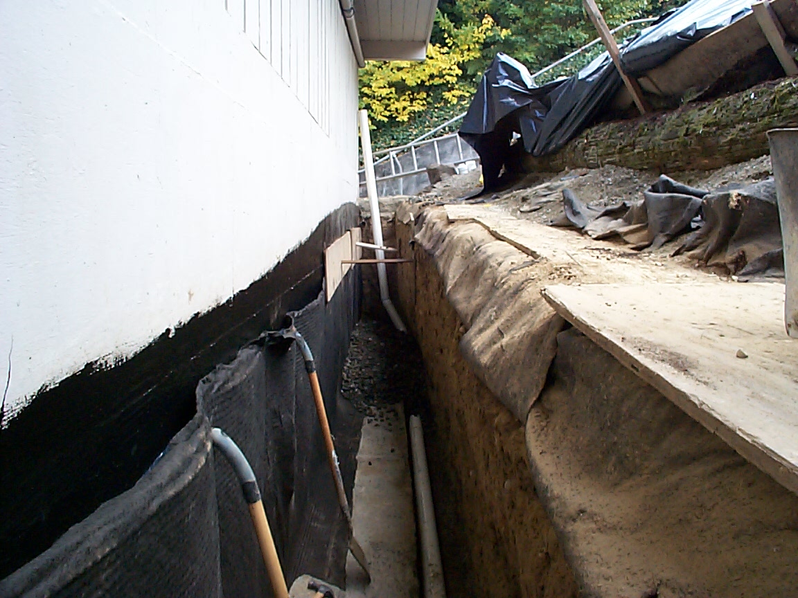 Some homes were built without footing drains or the drains are so badly deteriorated that they must be replaced. Generally this is accomplished by excavating a trench around the house to a depth below the elevation of the footings. The foundation wall is then cleaned and sealed with a waterproof coating. A perforated drainpipe is installed on the grade to slope towards the final outlet, and covered with drain rock.